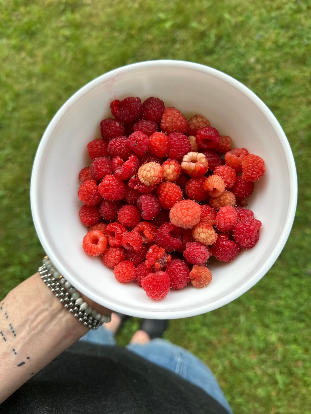 This afternoon I slipped on my clogs and shuffled over to the raspberry patch with a bowl in my hands. I started at the base of the thicket, picking, moving up to the top methodically. I stepped into the thorns, searching for the fruits hidden beneath. There’s an art to picking berries. You look at the color first, then gently wrap your fingers around the fruit. If it slides off the branch without effort, it’s ready. Any tugging and it’s not ripe enough.
